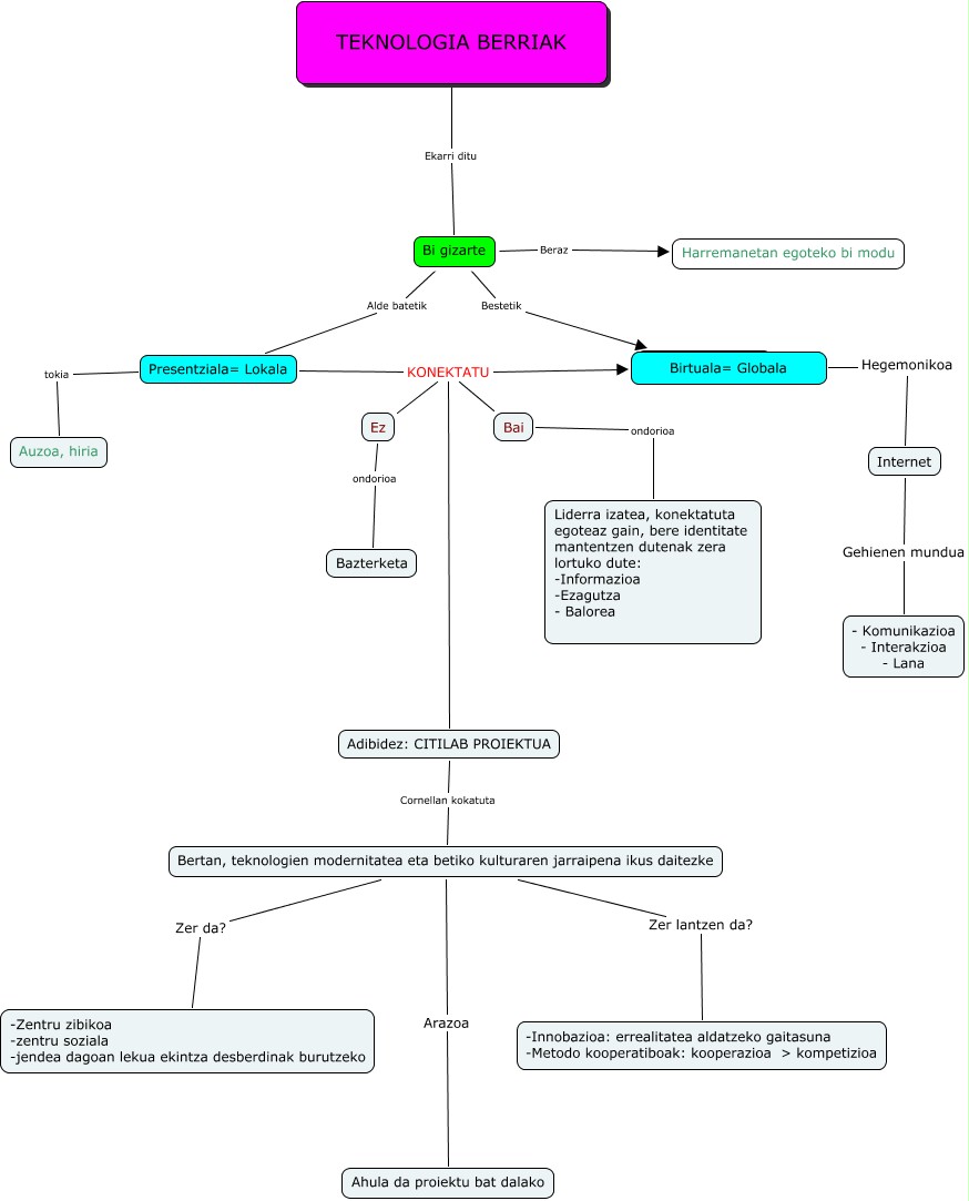 Hurrengo mapa klasean landutako bideo baten mapa kontzeptuala da. Klasean ikusitako bideoa, "Entrevista a Manuel Castells en Citilab" deitzen da, bereziki, bideo osoaren lehenengo zatia da. Bideoan, gaur egun informazio garaian gaudela kontuan hartuta, teknologia berriak gizartean duten eragina azaltzen da. Bideoan azaltzen diren datu garrantzitsuenak hurrengo mapa kontzeptualean adierazi ditugu.